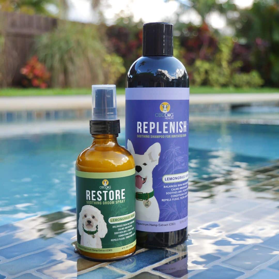 CBD grooming products for dogs, like Replenish CBD Shampoo and Restore CBD Groom Spray, are crafted to support skin hydration, coat softness, and overall skin comfort.